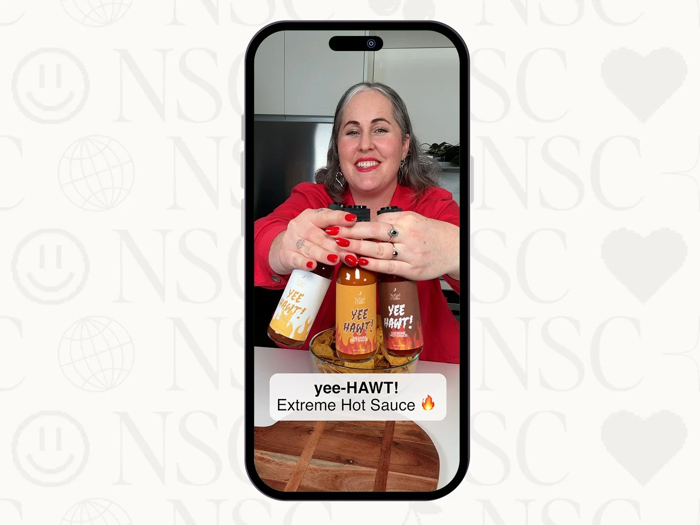“A comedic taste test, talking to iPhone, trying all three of the sauces on corn chips in a big bowl, starting mild and finishing with the spiciest. Each sauce gets a quick product shot, flavour notes, and my on-camera reaction.”